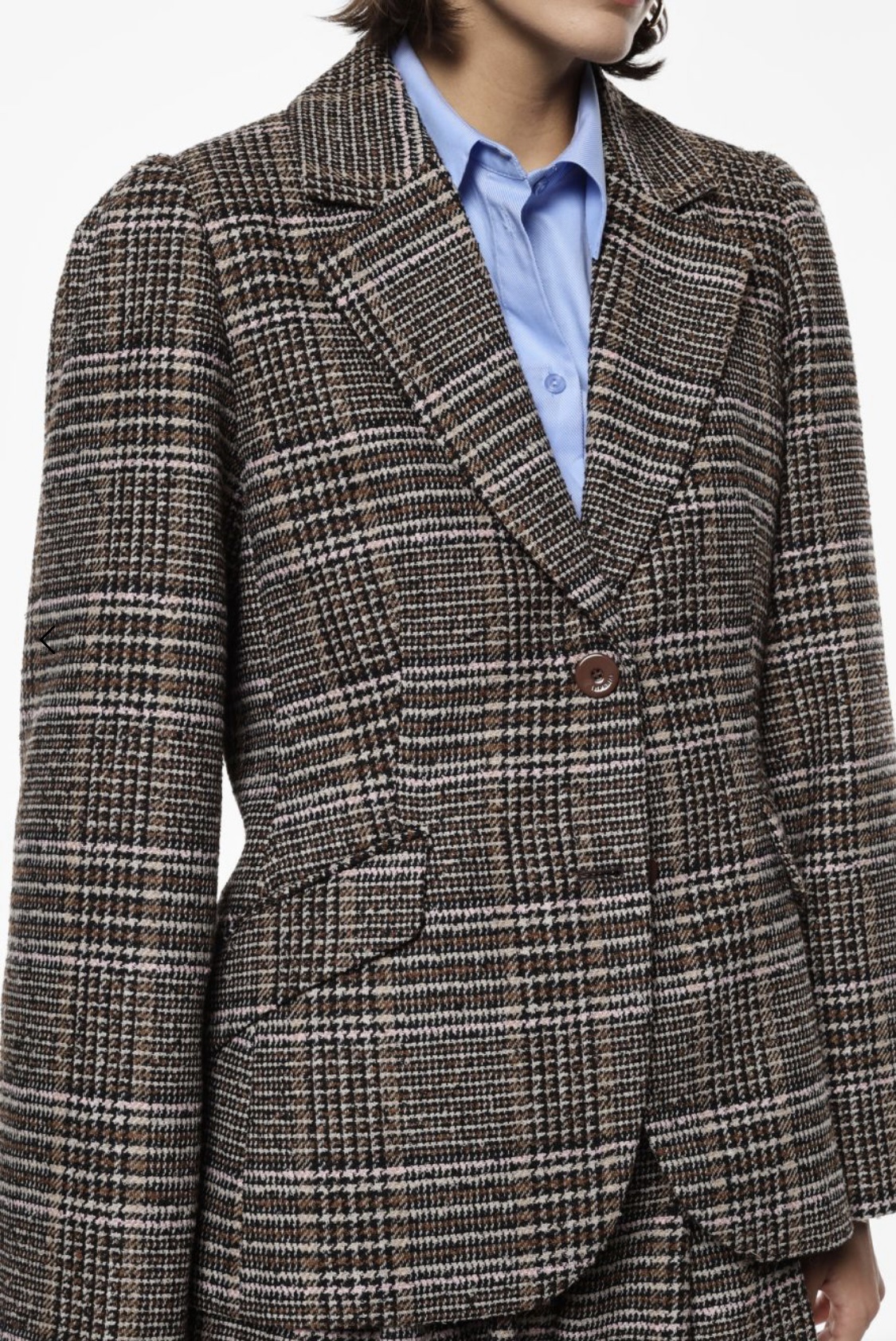 Blazer dalla silhouette strutturata, caratterizzato da un raffinato motivo check. La chiusura a due bottoni valorizza il revers classico e le tasche a patta donano funzionalità al design. Perfetto per creare abbinamenti ricercati e distintivi, ideale per un guardaroba metropolitano che privilegia versatilità e dettagli grafici d’impatto.